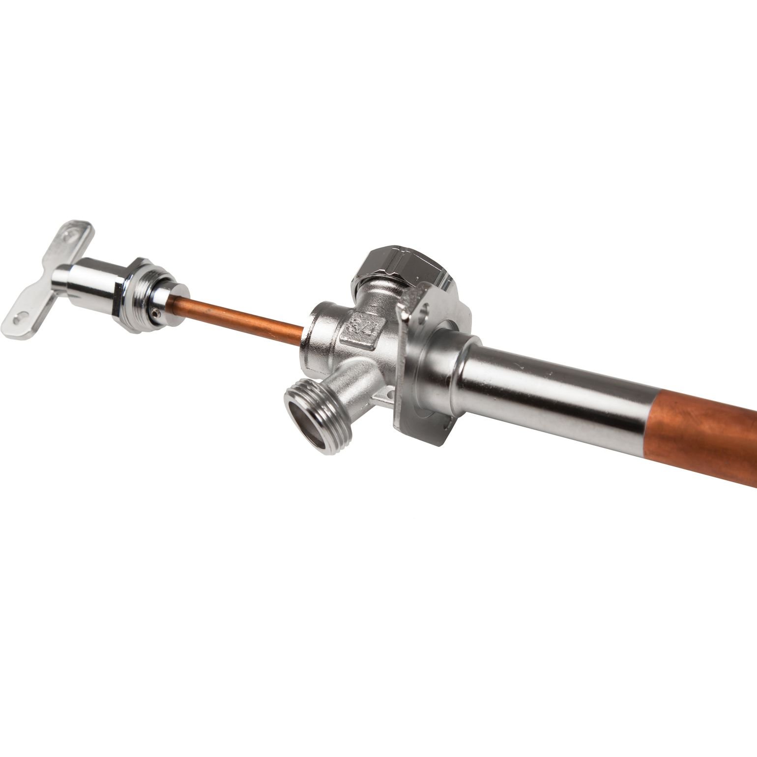 Уникальный в своём роде незамерзающий кран, который может быть подогнан под любой размер стены Вашего дома. Кран выполнен из бессвинцовой латуни и меди. Вместо вентиля у этого крана предусмотрен антивандальный съемный ключ под квадрат, что позволит не допустить использование крана посторонними. Для подключения трубопровода кран комплектуется угловым компресионным медным фитингом с седлом под проклдадку внутри. Для того чтобы укоротить кран, внутристенную медную трубку необходимо отрезать со стороны медного фитинга, а шток крана - со стороны съемного ключа.