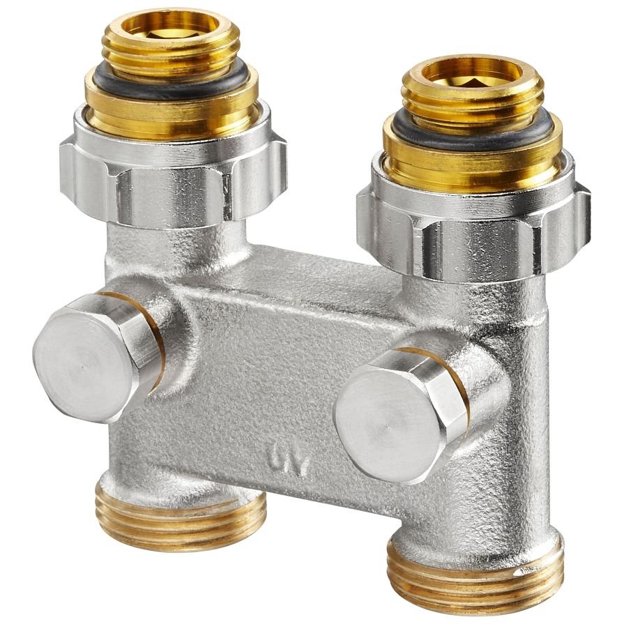 Перепускной узел нижнего подключения радиатора Oventrop. Выполнен из латуни, никелированный, межтрубное расстояние 50 мм, мягкое уплотнение, с функцией отключения. Multiflex.