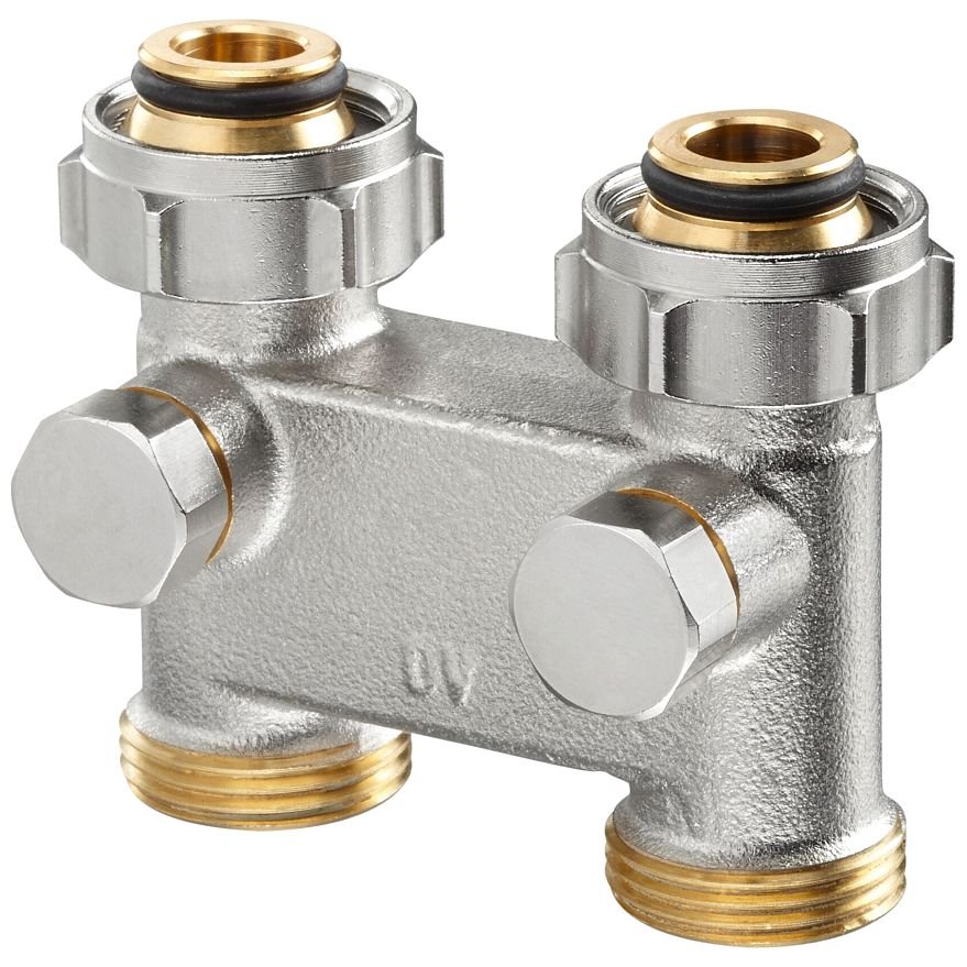 Перепускной узел нижнего подключения радиатора Oventrop. Выполнен из латуни, никелированный, межтрубное расстояние 50 мм, мягкое уплотнение, с функцией отключения. Multiflex.